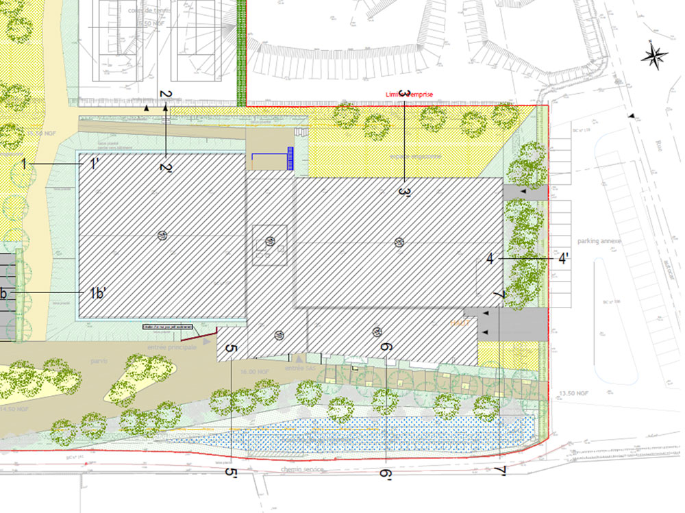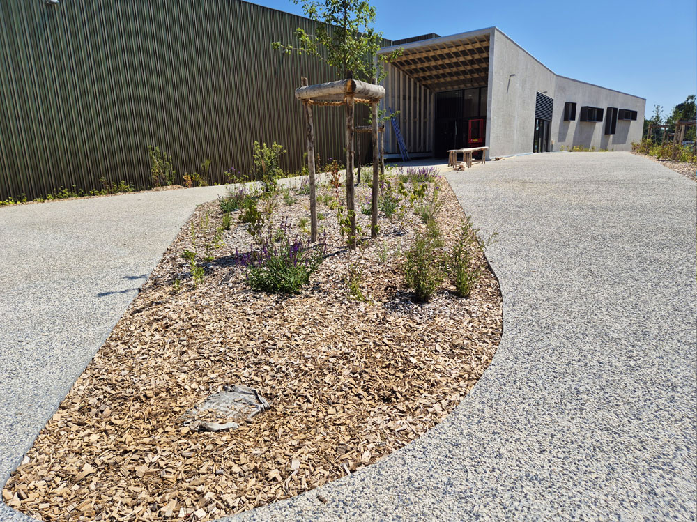 OCE Environnement est intervenu sur l’ensemble des missions de maîtrise d’œuvre VRD et paysage, en intégrant une approche hydraulique privilégiant une gestion alternative des eaux pluviales à la parcelle. Cette démarche répond à un double objectif : assurer une insertion harmonieuse du bâtiment dans son environnement et créer des continuités lisibles entre les différents équipements du site.